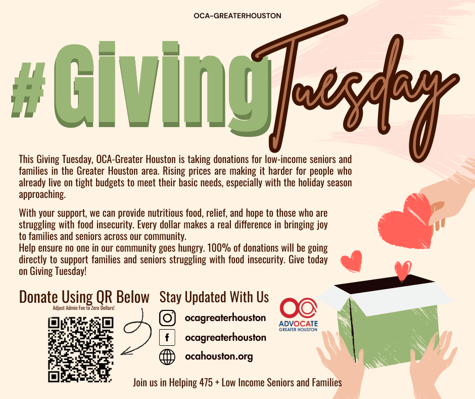 This Giving Tuesday, OCA-Greater Houston is taking donations for low-income seniors and families in the Greater Houston area. Rising prices are making it harder for people who already live on tight budgets to meet their basic needs, especially with the holiday season approaching.